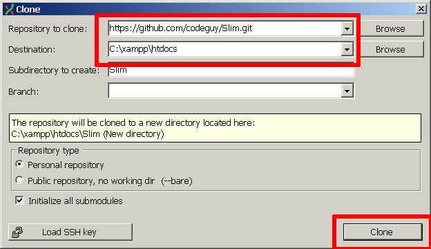 In the resulting "Clone" dialog box, enter the clone URL obtained in the first step. Set the destination directory to the htdocs\ subdirectory of your XAMPP installation directory (typically, C:\xampp). Optionally, change the name of the subdirectory that will hold the downloaded code.