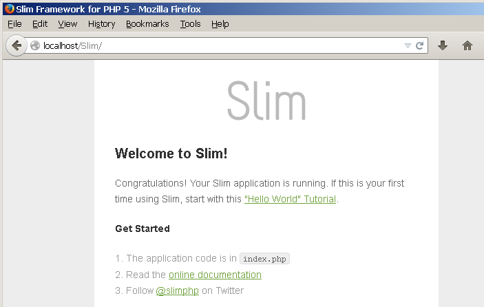 At this point, the code has been downloaded from the remote git repository and you can begin using it. In this particular case, since the Slim framework includes a starter application, you can simply browse to the URL http://localhost/Slim and you should see the example application’s welcome page, as shown below.